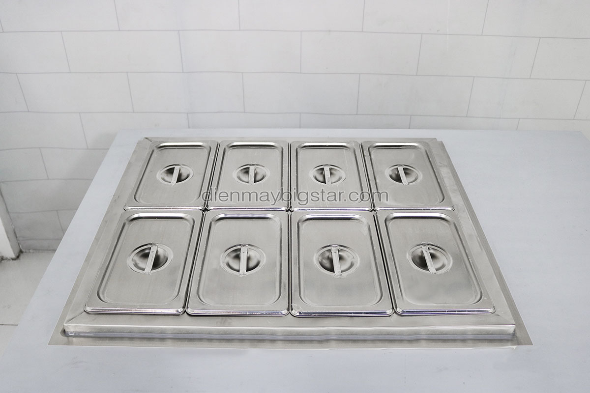 + Mặt trên bàn được thiết kế để chứa các khay inox có nắp đậy đựng thực phẩm. Và các khay inox này cũng được trang bị kèm theo với hệ thống làm mát. Cụ thể các loại khay cho bàn salad thường dùng là khay 1/1, 1/2, 1/3, 1/4, 1/6, 1/9.