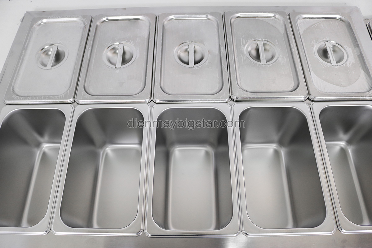 Mặt trên bàn được thiết kế để chứa các khay inox có nắp đậy đựng thực phẩm. Phần phía dưới là các ngăn tủ mát để bảo quản các loại đồ ăn dự trữ (bất cứ khi nào có nhu cầu, thực phẩm trưng bày bên trên hết cũng nhanh chóng được bổ sung lên).