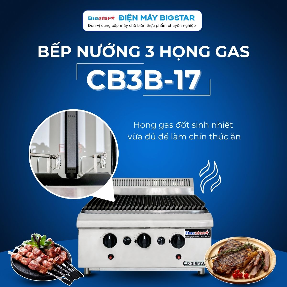 Bếp nướng 3 họng gas Berjaya CB3B-17 thuộc loại bếp nướng than nhân tạo dùng gas sử dụng than nhân tạo được đốt nóng bởi những họng gas sinh ra nhiệt lượng vừa đủ để làm chín thức ăn, không làm thực phẩm bị cháy, khét và tiết kiệm gas khi nướng.